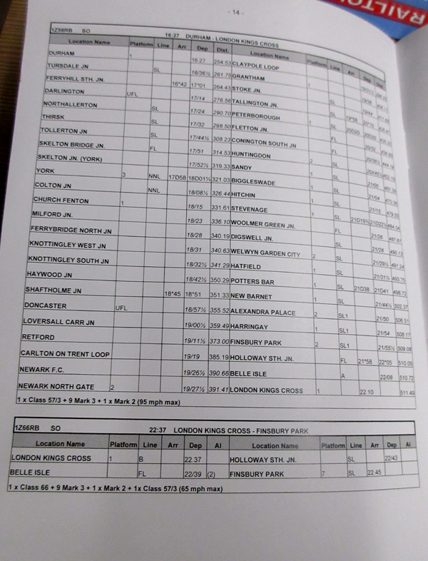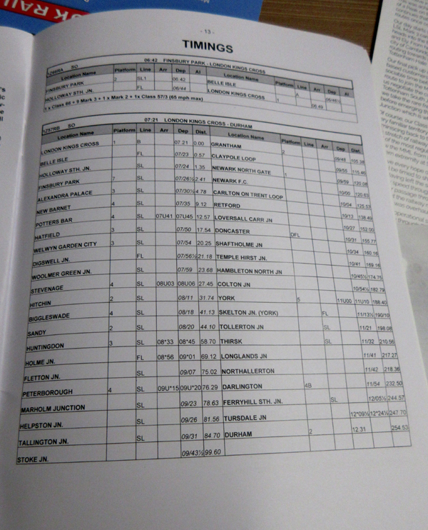 Route o/w – Finsbury Pk – Kings X – Hitchin – Posh – Doncaster – York – Durham