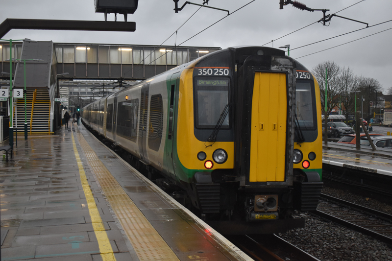 350250 at a damp Leighton Buzzard working the 1356 Euston – Birmingham on Dec 18th 2025