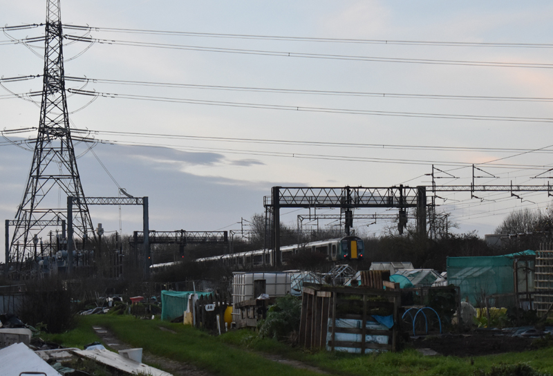 350254 passes the clutter at Linslade allotments working the 0636 Birmingham – Euston on December 19th 2025