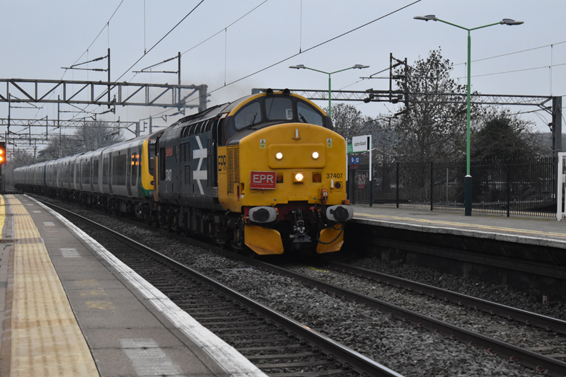 37407 has been busy moving the off lease 350’2’s from both Northampton and Wembley storage sidings, here’s the large logo machine growling through Leighton with 350240 and 350241 (the last of the Wembley stored units) on December 23rd 2025