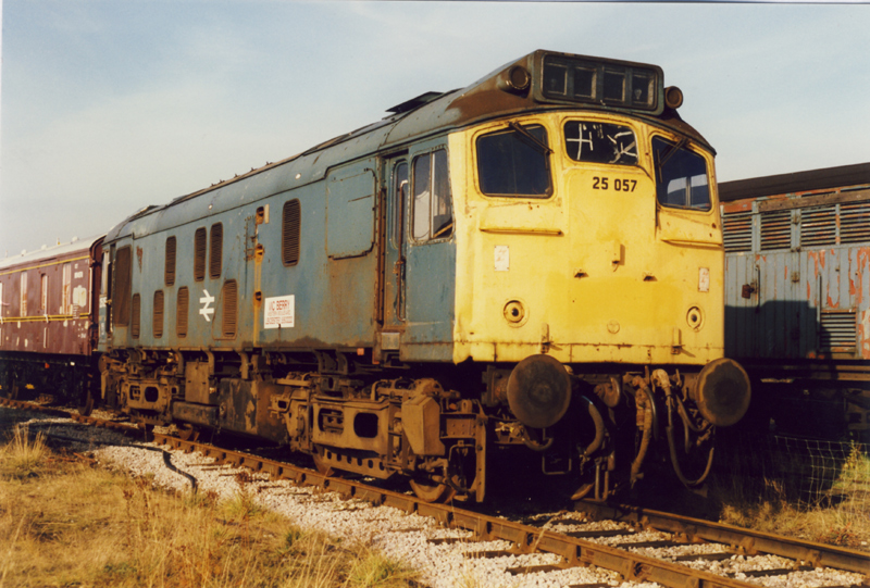 On entering preservation 25057 was privately purchased. Still sporting “Vic Berry’s” stickers 25057 is seen in December 88 at Quainton. Her stay at Quainton saw her reportedly running again but alleged metal theft here played a factor in her being sold to the North Norfolk Railway in 1991.