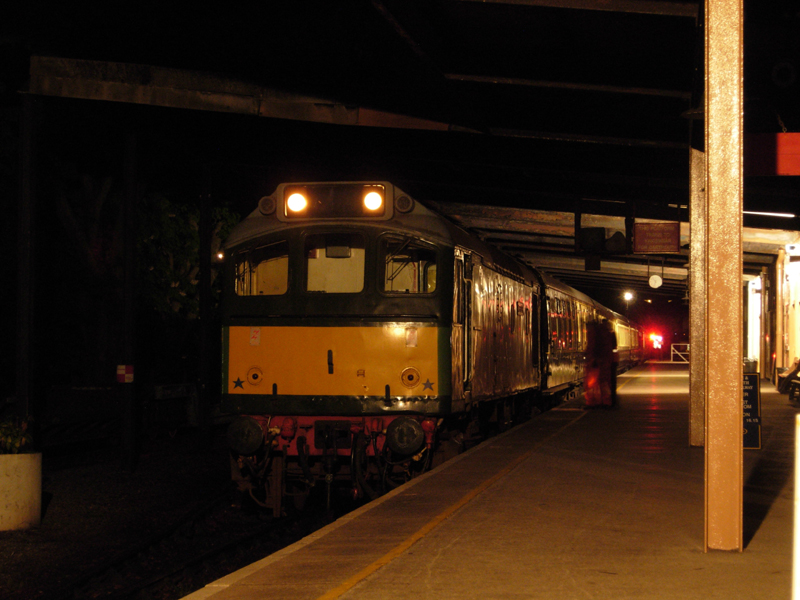 Various galas, running days, Thomas days, kettle shortages and festival additionals saw 25185 perform a few times each season on passenger, with engineers trains keeping her very busy off season. One memorable evening was in association with the Dartmouth Music Festival (glorified piss up) on May 9th 2009. Departure around 1900 was delayed after the wrong pipes had been coupled from the loco to lead coach. The driver was obviously wound up by this and we had a breathtaking, claggy run to Kingswear. The return working was around 2200 ex Kingswear and we arrived back at a worryingly blacked out station 15 minutes before departure time with stock but no 25 anywhere to be seen. 5 minutes before departure time the 25 returned, the station lights were put on and in no time and a few of us were bellowing out of our front coach compos for a rare late night rat run in preservation. Back at Paignton we hurriedly took our phots before being locked in the station!