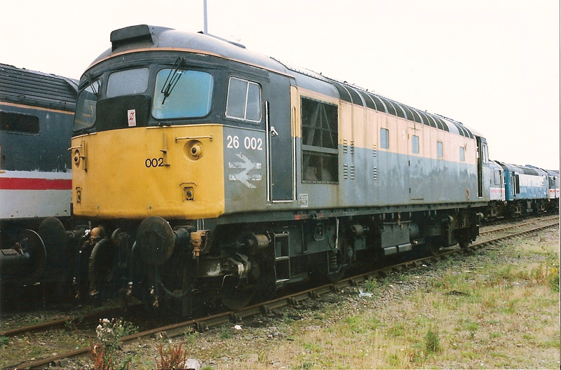 The last time I recall having 26002 was when it was paired with 26007 on Pathfinder’s 1Z36 0612 Bristol TM to Ayr Coal Scuttler Railtour on Saturday 25 May 1991. This involved having the pair from Killoch to Falkland Yard and Waterside to Ayr scratching in some new track in the process….”.