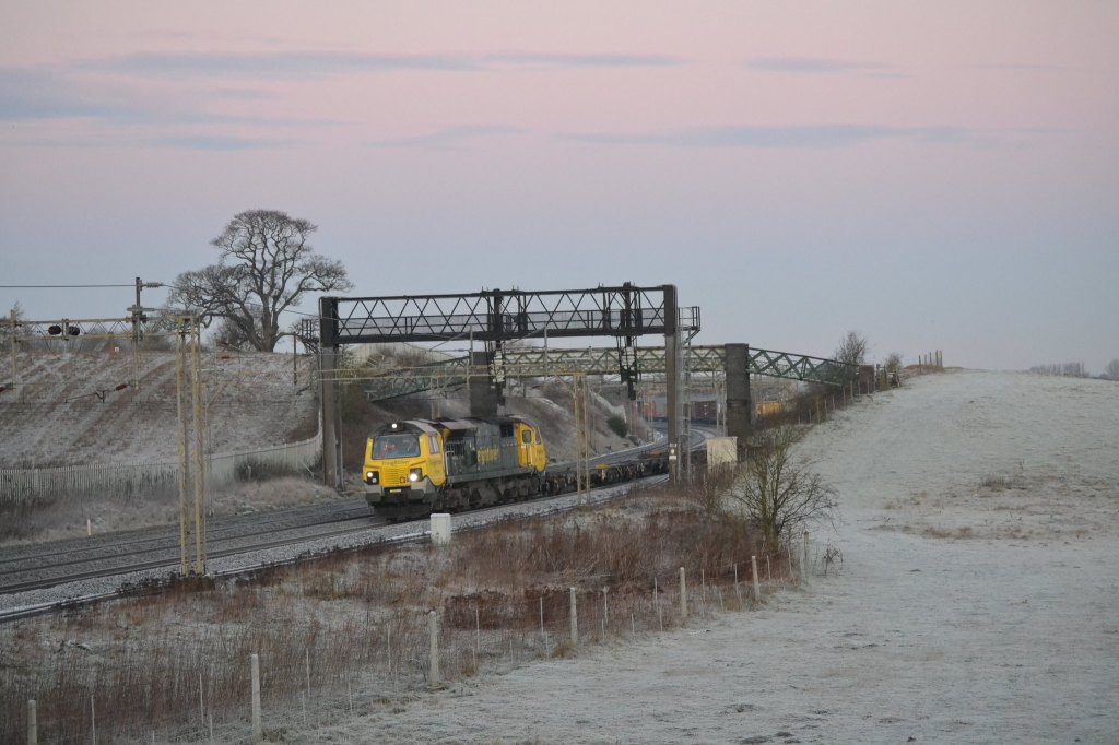 Friday November 21st – The rising sun just lights up the cab and driver of 90010 and 90008 at a frosty Old Linslade with 4L89.