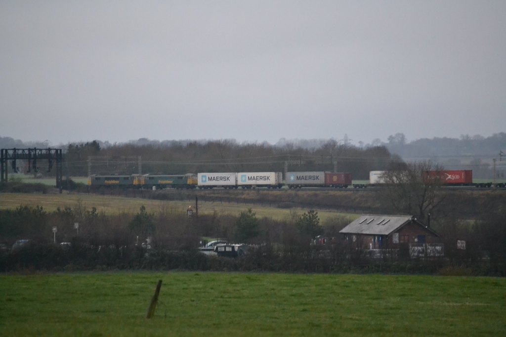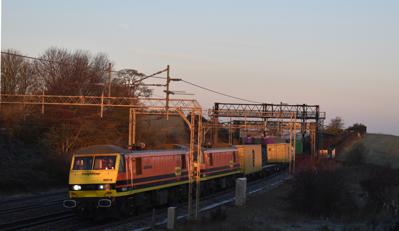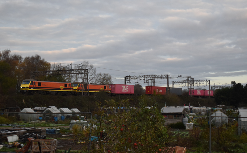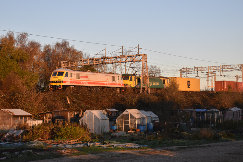 Thursday November 20th – Perfect light on Freightliner 60 retro liveried 90018 and 90045 pass Linslade allotments with 4L89