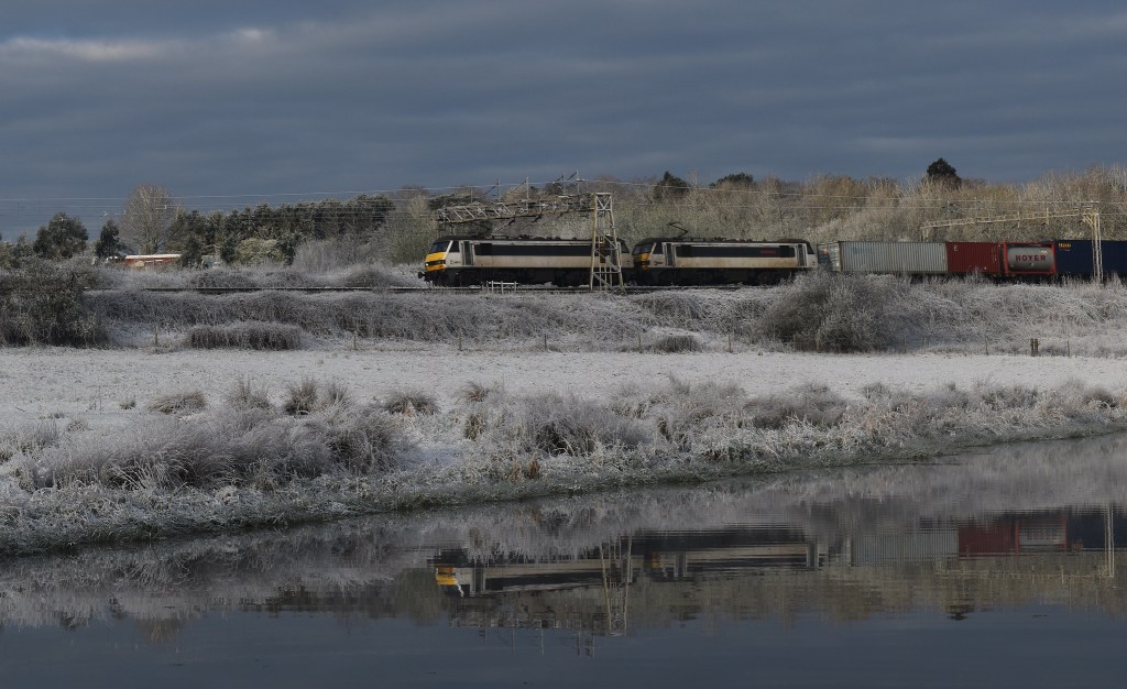 A late snowfall creates a picture postcard scene as recently transfered (from GE) 90013 and 90007 are reflected in the canal waters at Chelmscote on 4L89 on April 7th 2021