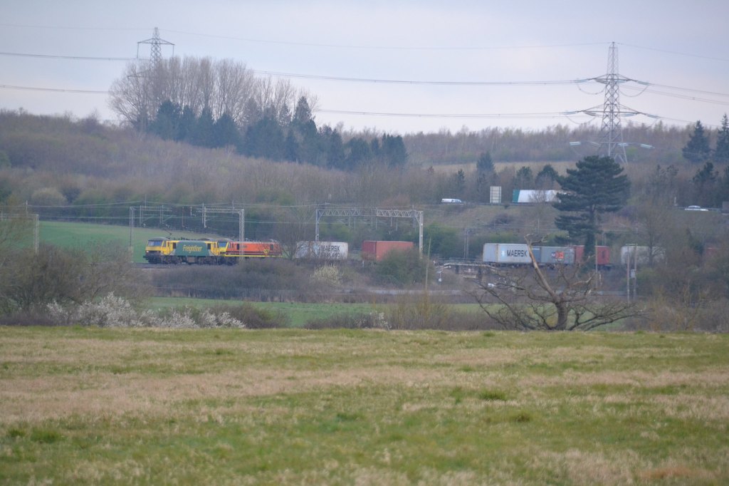 Dwarfed by the pylons carrying the Claydon – Sundon National grid line, 90045 and 90014 pass Grove with 4L89 on March 31st 2022