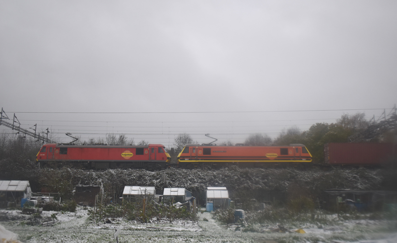 Tues November 18th – Total gloom at Linslade allotments as former Anglia duo 90010 and 90008 pass with 4L89
