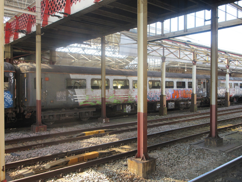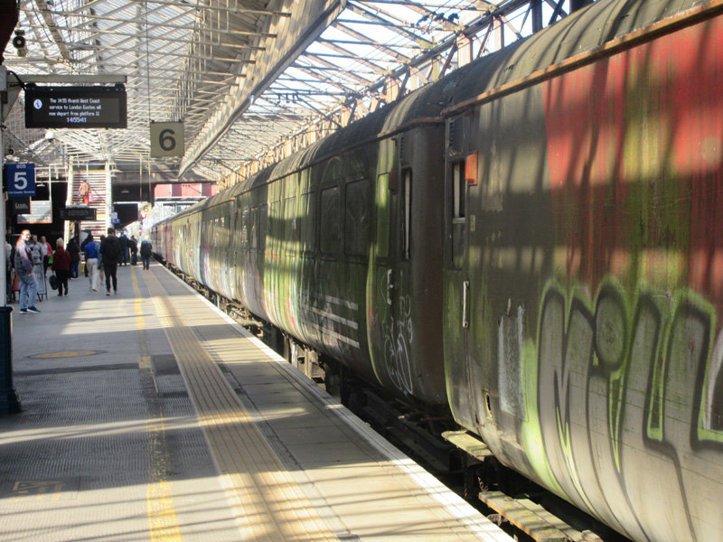 A very unusual ECS move from Southall to Carnforth saw 57012 stop at Crewe’s platform 6 mid afternoon on Wednesday April 22nd. The first 4 vehicles (and rear) of the 13 coach consist were in normal operating condition, the remaining 8 Mk II’s were in an extremely rough state with graffiti and smashed windows.