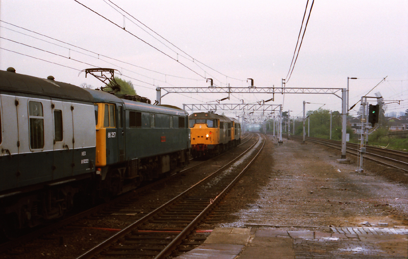 Bletchley quickly kicked out 31116 and 31317 to assist but control decreed the failure should go forward emcars. In this Leighton view, 86257’s pan is still up despite having expired
