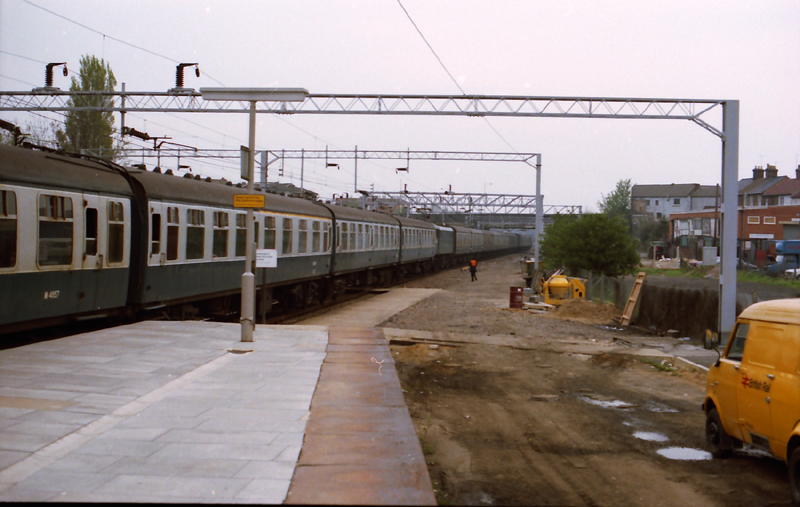 85019 is about to be detached from the 11 mk 1’s of the failure at Leighton station. The rear coaches are well off the platform as normal in these times, nobody worried about HSE madness back then