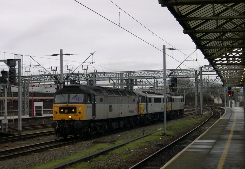 Better in grey, 47303 drags demic 86632 and 86637 through Crewe, December 29th 2004