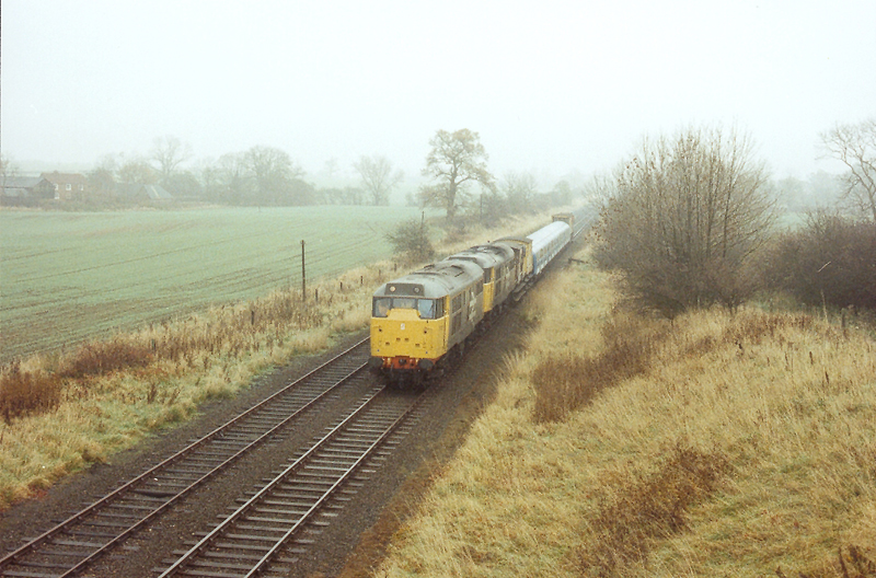 31215 and 31161 approach Swanbourne as the mist lifts with a prototype BREL Central line tube train move from Washwood Heath to Neasden