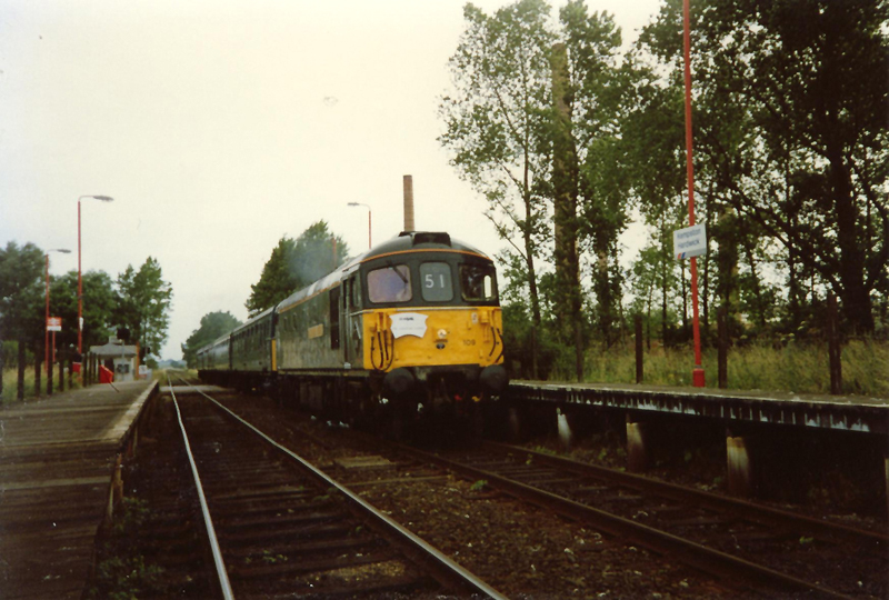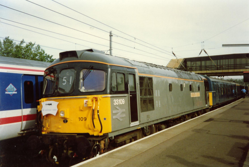 “TC” catches 33109 passing Kempston Hardwick on the Bedford-Bletchley with the tour, the solitary chimney is from the local brickworks which has since been demolished although the brick work’s ground work’s remain much as before 20 year’s later