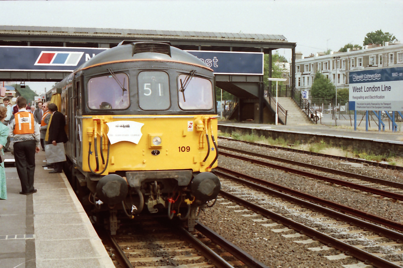 The tour consist was very uncranky, not helped being wedged in a 4TC, my notes from the time claiming a “highly yuppie Bedford boating crowd!”. At Kensington Olympia we were initially alarmed at 33109 shutting down. This was for a naming Ceremony here with “Captain Bill Smith RNR” plates being revealed. Captain Bill had played a major role in steam loco preservation. After Kenny O we thrashed on including the unusual Southfields route.