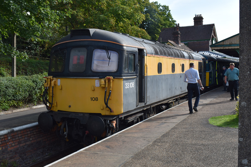 Hired in from the Severn Valley 33108 looked and sounded the part on departure from East Grinstead with the 1015 to Horsted Keynes