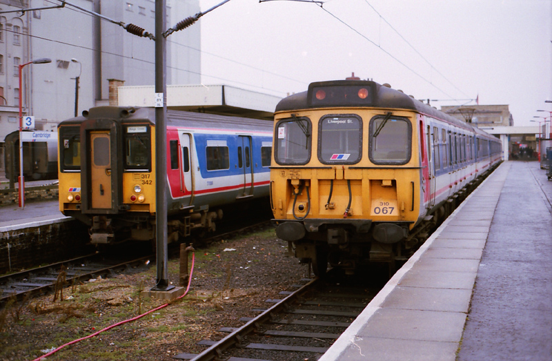 With 317342 on a Kings X service alongside 310067 awaits departure time with the 1255 to Liverpool St on 091288.