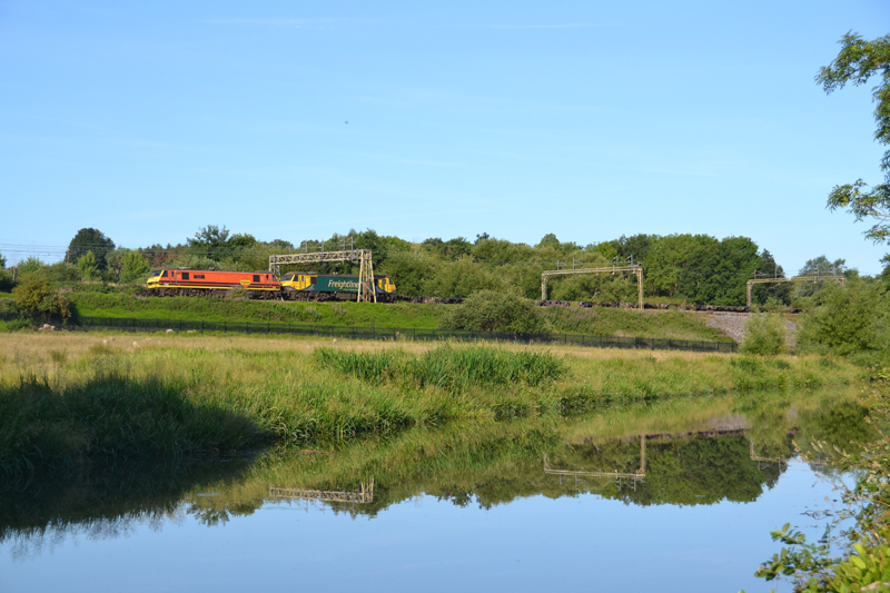 66207 (possibly) passes the still canal waters with 6M77 Acton – Forders loaded spoil