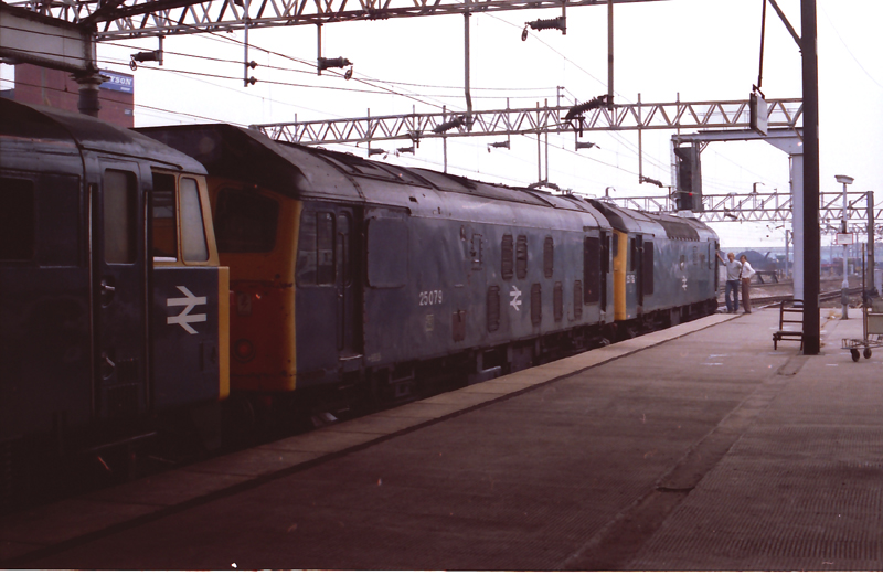 25176 and 25076 at Rugby after a good run dragging 87025 on the 1245 Euston – Glasgow from Bletchley, the “seven” went forward from here unassisted on Sunday July 31st 1983