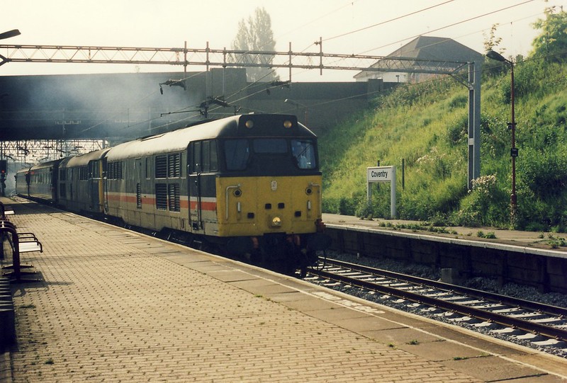 Due to many 47’8’s being confined to shed, other power produced on various cross country services for a few mad days in 1997. Heres 31420 and 31434 arriving at Coventry with the 0603 Padd – Manchester which they worked throughout on August 9th 1997.