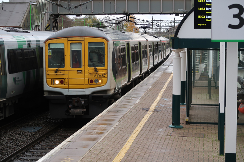 A daytime and Sunday 319 at Leighton, 319457 arrives with the 1352 Euston – M.Keynes, 19th Nov 2023