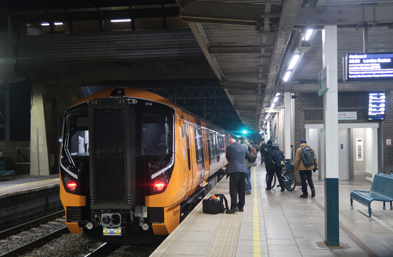 The final 730 turn of Dec 1st (and all next week) is the 1734 Euston – Bletchley with 730007 and 730014 seen here at Euston with passengers waiting for the guard to release the doors.