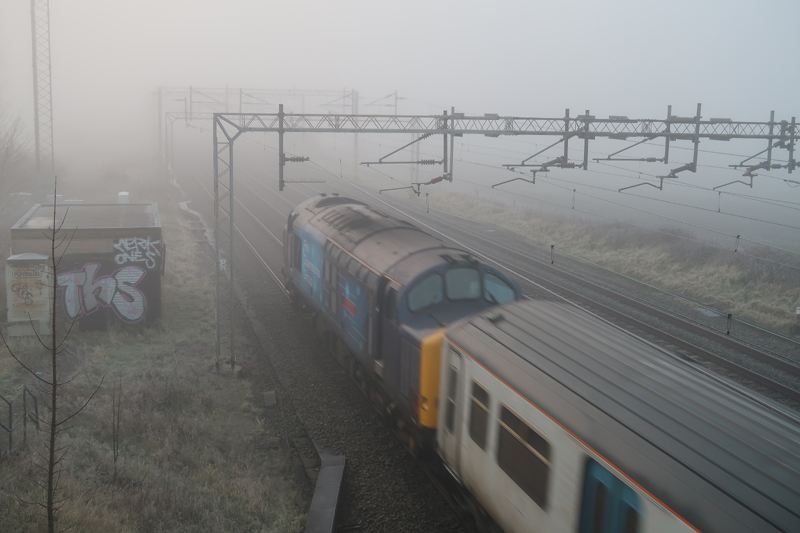 Farewell 319219 and 214 as they are dragged South through an extremly foggy Ledburn with 37800 providing the power from Northampton to Newport Sims on December 6th 2023