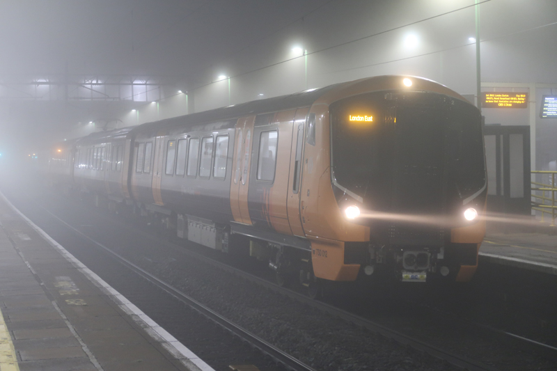 The fog adds some atmosphere to this Leighton station view of 730012 and 730021 on the 0603 Bletchley – Euston on December 6th 2023
