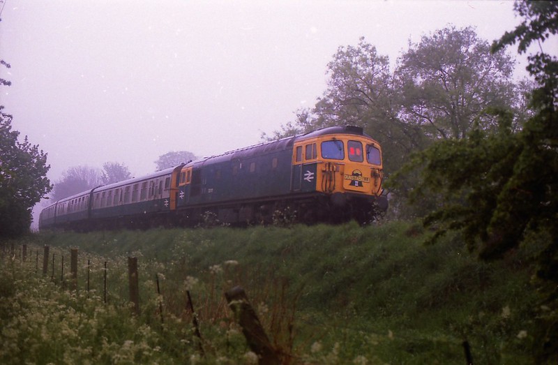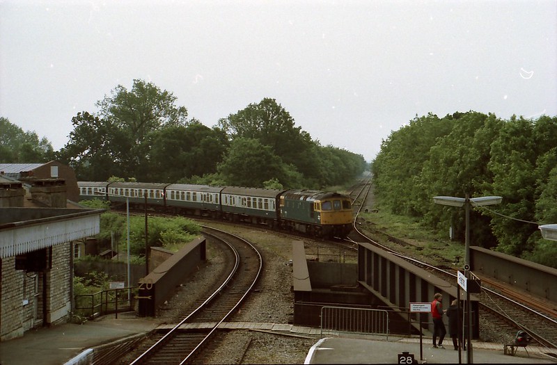 33111 waits at the temporary Dunstable Kingsway platform (behind 4TC) with an “ADAPT” Dunstable – Portsmouth ADEX on May 8th 1988. Whilst 33’0/2’s occasionally visited the Dunstable branch on cement, “bagpipes” were very rare, especially on passenger!
