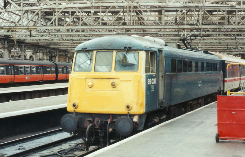 By August 1990 roarers were becoming uncommon at Glasgow Central, here 85037 awaits departure time with the 1345 Relief to Euston on August 24th 1990