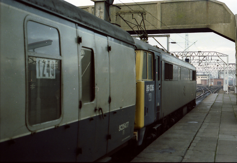 Rare birds in daylight by 1985, 86036 at Crewe with 1Z49 1205 Bristol – Edinburgh Relief on January 2nd 1985