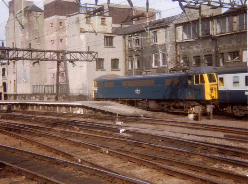 Unmodified, diamond pan fitted 86004 arrives at Glasgow Central with emcars on April 25th 1982