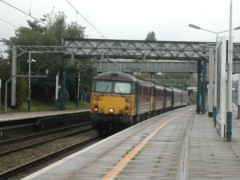“Red Cow” catches the 5Z62 convoy with 87006 dragging 87014 and 87024 and 2 coaches South through Leighton Buzzard on September 30th 2004