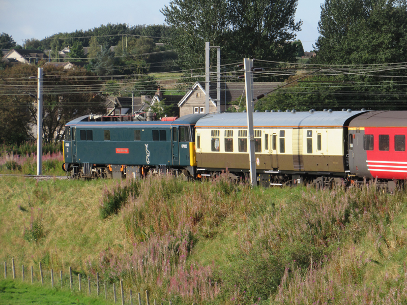 Railtour duty for 87002 on September 16th 2016, seen here at Carstairs South Jn with an Edinburgh – Liverpool GBRf charter