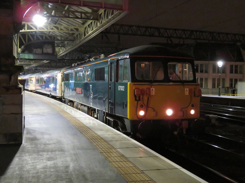 My lord’s…..87002 at Glasgow Central prior to departure with 1M11 2340 Glasgow – Euston Caledonian sleeper on December 27th 2016