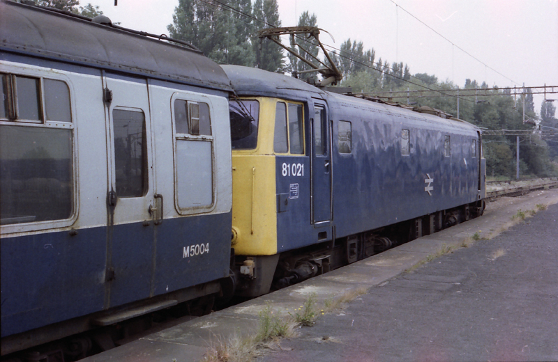 Journey over, 81021 rests at Northampton after screaming North on 1B07 1718 Euston – Northampton on Sep 9th 1985