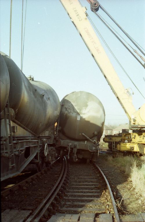 The derailed cement wagons on the cement works triangle await recovery