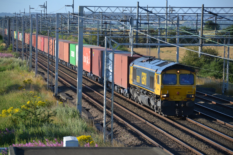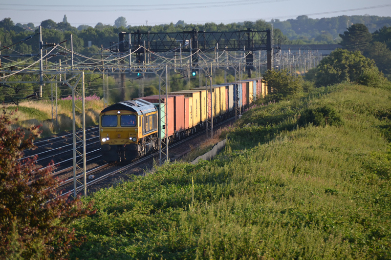 66701 heads North with the early morning Felixstowe – Trafford Pk