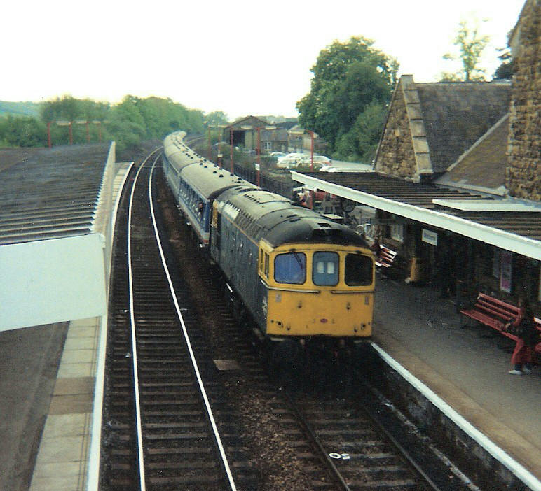 33208 arrives at Sherbourne with 1O19 1047 Exeter – Waterloo on May 5th 1988
