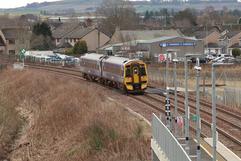 Taken from the station footbridge, 158706 leaves Kintore on the double track section with the 0701 Inverness – Aberdeen on February 8th 2023