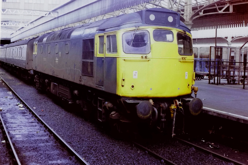 A platform level view from the late Tony Ewer of 27109 steaming nicely with the 0830 Inverness – Aberdeen on May 29th 1982
