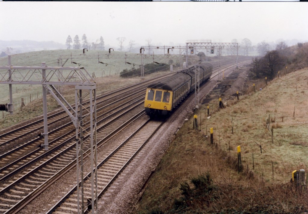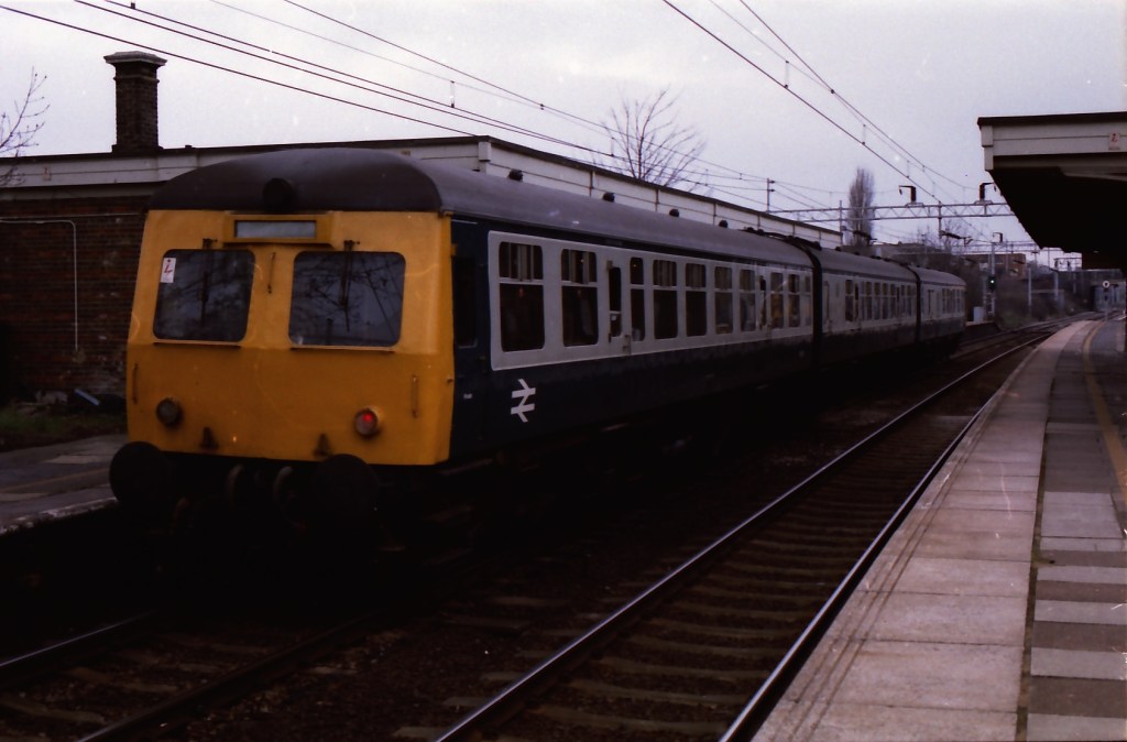 A seriously rare visitor at Kings Langley with former Bedford – St Pancras class 127 borrowed from Gospel Oak – Barking with 51607, 51640, 51624 and 51610 on a Euston – Tring additional on December 20th 1983. 3 Tyesley 3 car sets were also out that memorable day.