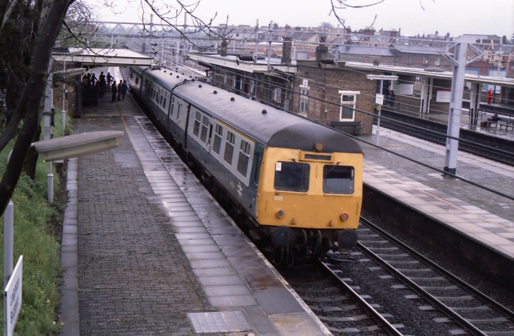 Bedford – Bletchley sets 51914 and 53463 arrive at Leighton Buzzard with a Euston – Bletchley service on April 7th 1991