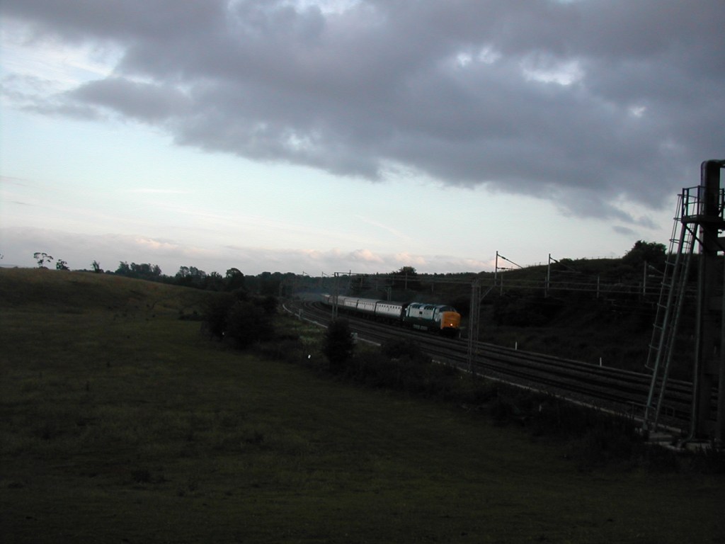 In fading light (at 2022) 55019 blasts along the down fast at Old Linslade with a return Salisbury – Preston Railtour on July 2nd 2005