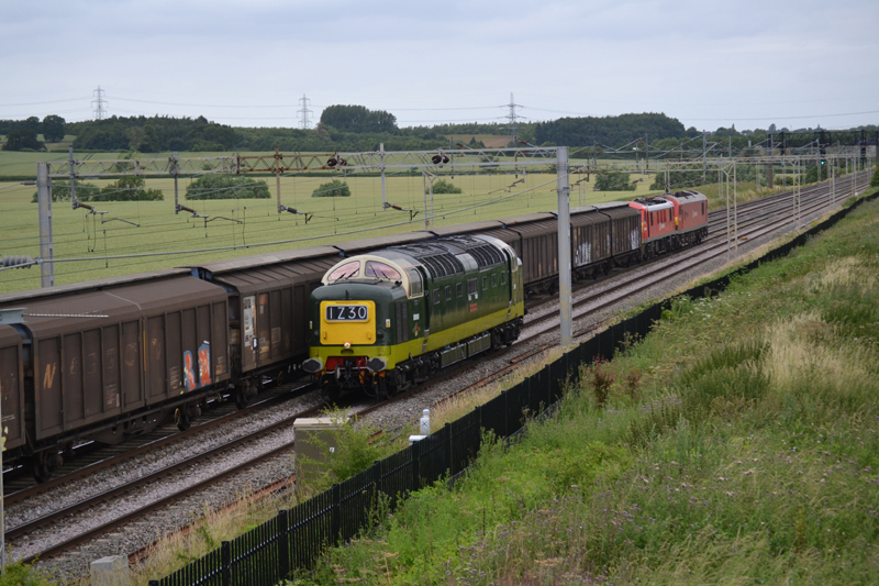 55009 “Alycidon” is a rare visitor to the WCML at Ledburn on July 6th 2015. She was returning 0Z33 to Willesden from Toton after railtour work on July 4th. Adding to the scene are 92016 with 90018 dit on 6B41 Wembley – Daventry water bottles freight.