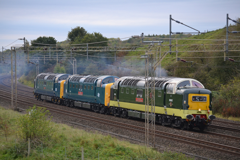 The Napier drone of 55002 could be heard on the Southerly breeze long before this mighty impressive convoy passed Old Linslade on October 9th 2017. 55002 is dragging 55019 and 55009 from East Grinstead to the NRM York via 2 drop off points. The Deltics had been at the Bluebelles deltic event the weekend before. We believe this was the first visit of 55002 to the Southern WCML and first ever local “triple Deltic” too