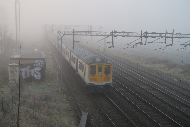 Thick fog swirls atmospherically around Ledburn as 37800 drags 319217 and 319219 from Northampton to Newport Sims for scrapping on December 6th 2023