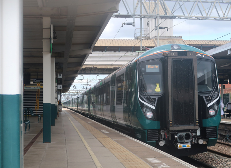 730205 with 730220 leaves Bletchley on the inagural day of all day diagram with 2K27 1209 Euston – M.Keynes on June 23rd 2025
