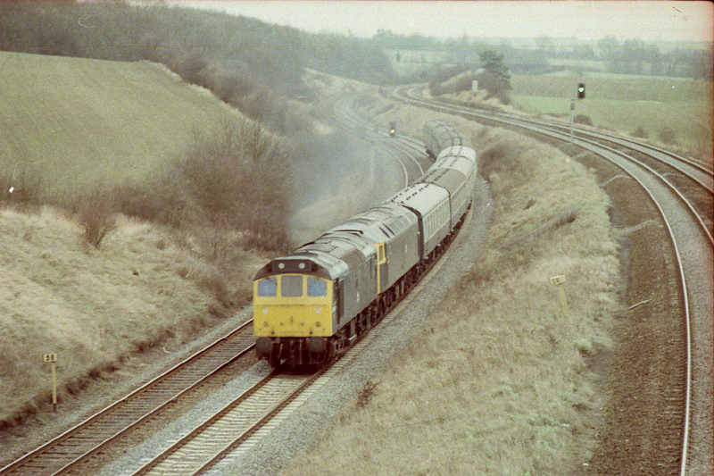 The shots north of Sharnbrook Junction are taken from the roadbridge linking Sharnbrook and Souldrop. The bridge is quite narrow and has traffic lights at both ends. This bridge has had a lot of recent rebuilding work for electrification. The bridge needed raising over the fast lines as there is not enough height to put the wires under the old bridge. Traffic lights still control the bridge and there is still a shot looking Northwards. The Southbound shot is no longer possible due to a forest of masts and wires and the slow lines have been singled.