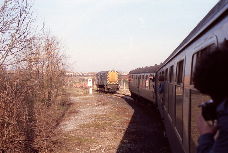 A couple of disappointments on getting the tickets a few days before the tour. The advertised 33’s were to be replaced with 37’s and the Frome – Radstock freight only branch had been dropped due to track condition. The Radstock branch was to offer few other chances as total route closure came a few years later. As consolation for the lost Somerset branch the Swindon-Highworth branch’s remaining stub to the car works was added with the bonus of 08 haulage.